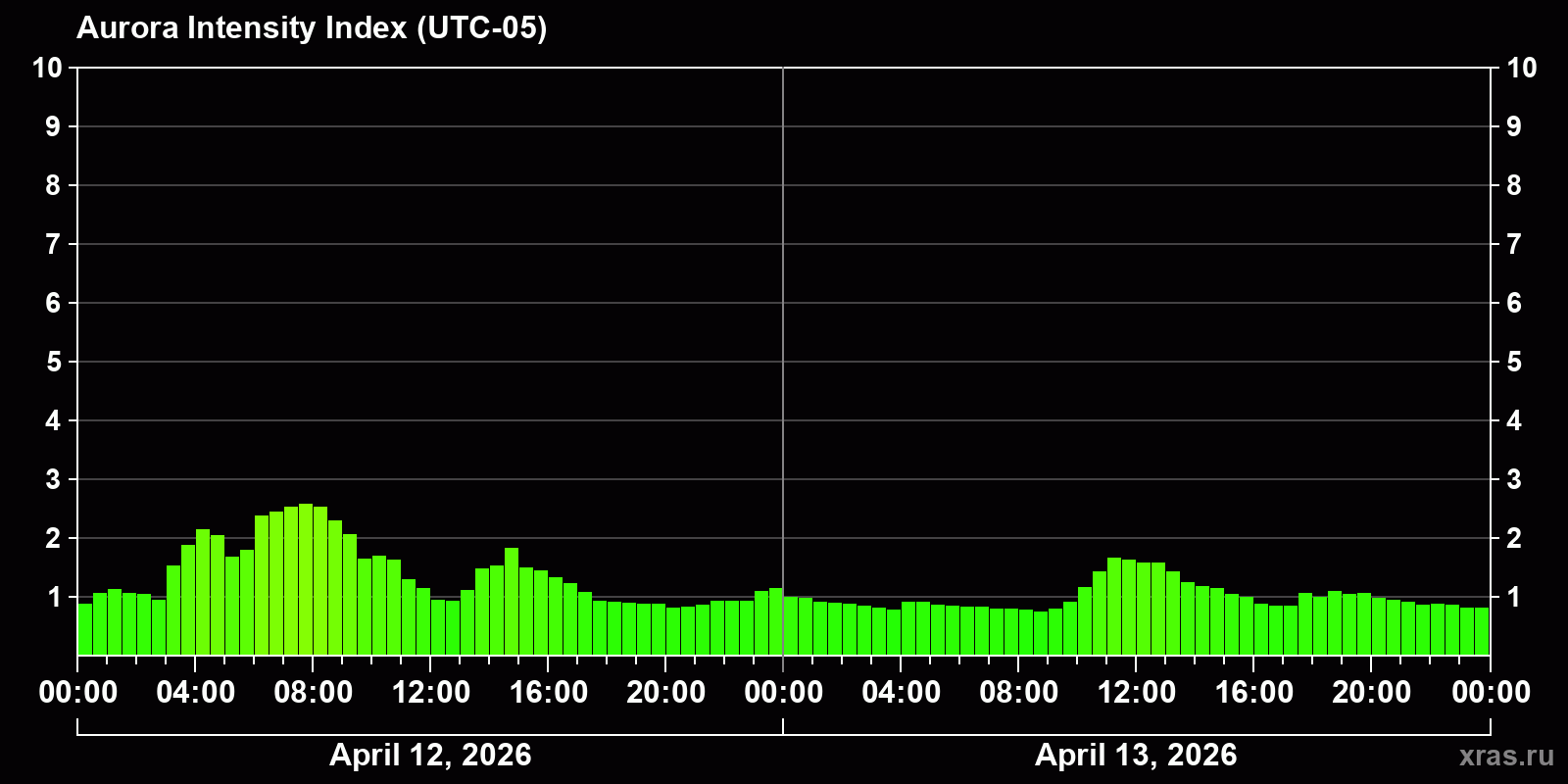 Changes in the auroral intensity index from 2026-04-12 to 2026-04-13 local time