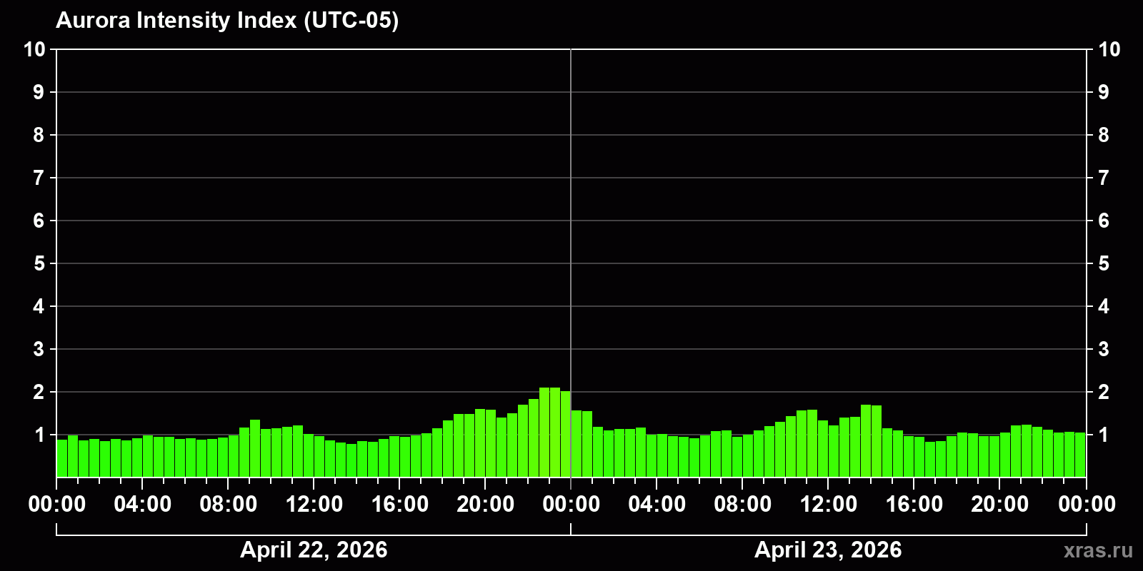 Auroral intensity index and the theoretically possible latitude of observations for nighttime in the Western Hemisphere as of 2026-04-23 23:45 (end of day) local time