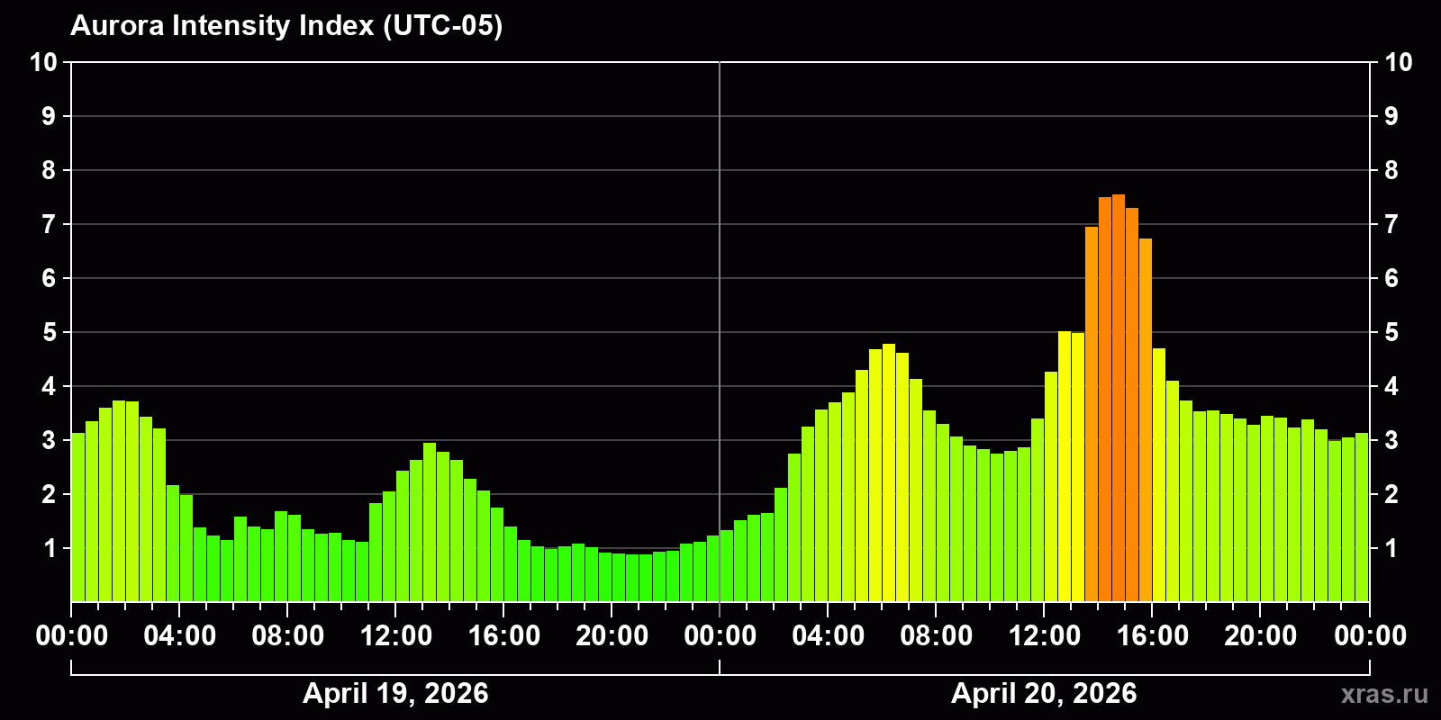 Auroral intensity index and the theoretically possible latitude of observations for nighttime in the Western Hemisphere as of 2026-04-20 23:53 (end of day) local time