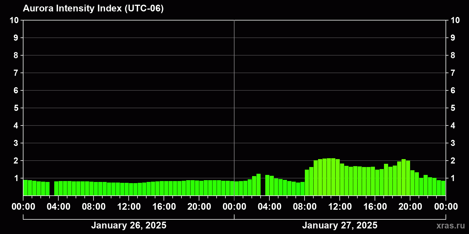 Changes in the auroral intensity index from 2025-01-26 to 2025-01-27 local time