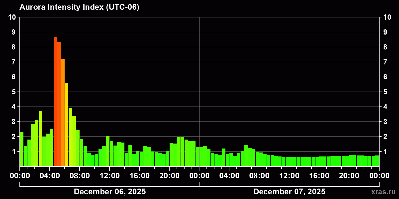 Auroral intensity index and the theoretically possible latitude of observations for nighttime in the Western Hemisphere as of 2025-12-07 23:45 (end of day) local time