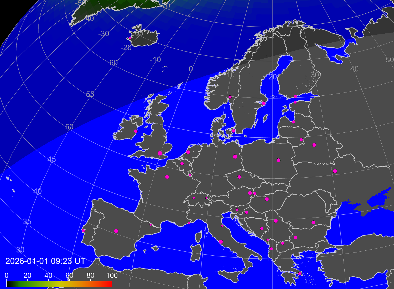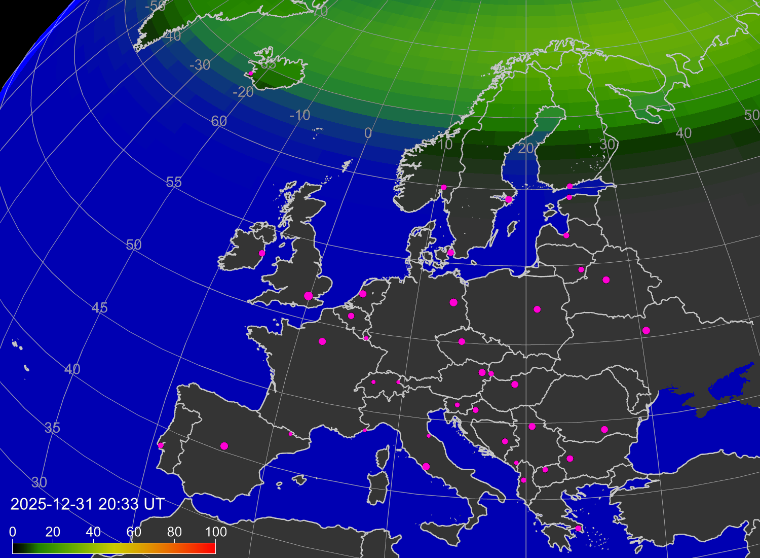 Индекс интенсивности полярных сияний и теоретически возможная широта наблюдений для ночного времени в восточном полушарии