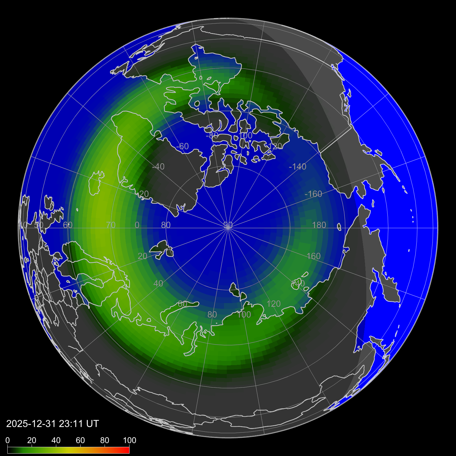 Изменения и часовой прогноз индекса интенсивности полярных сияний с 2025-12-31 по 2026-01-01