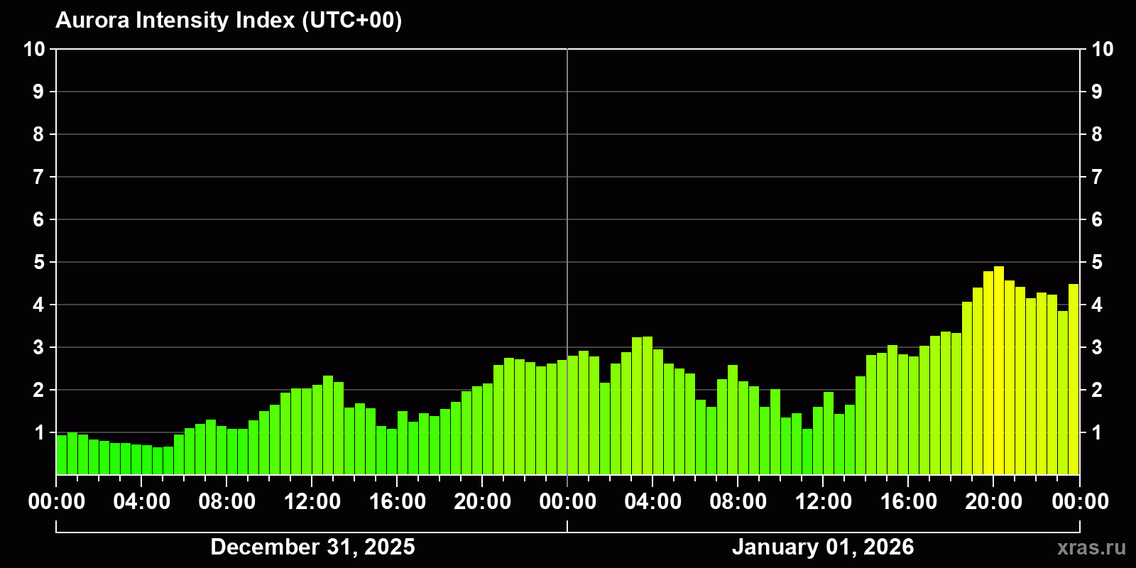 Auroral intensity index and the theoretically possible latitude of observations for nighttime in the Estern Hemisphere as of 2026-01-01 23:51 (end of day) local time