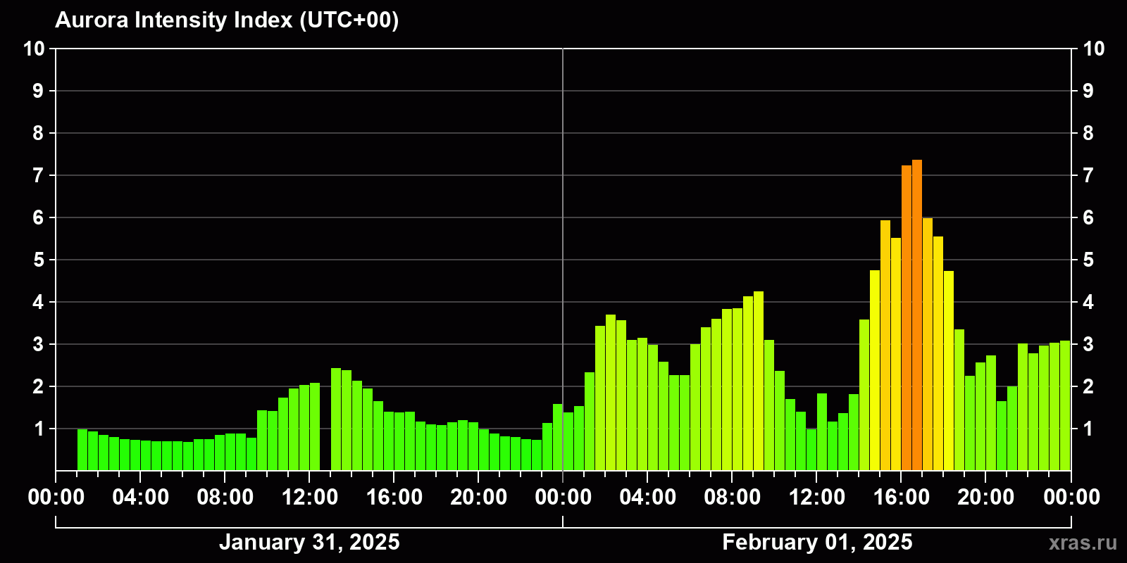 Auroral intensity index and the theoretically possible latitude of observations for nighttime in the Estern Hemisphere as of 2025-02-01 23:45 (end of day) local time