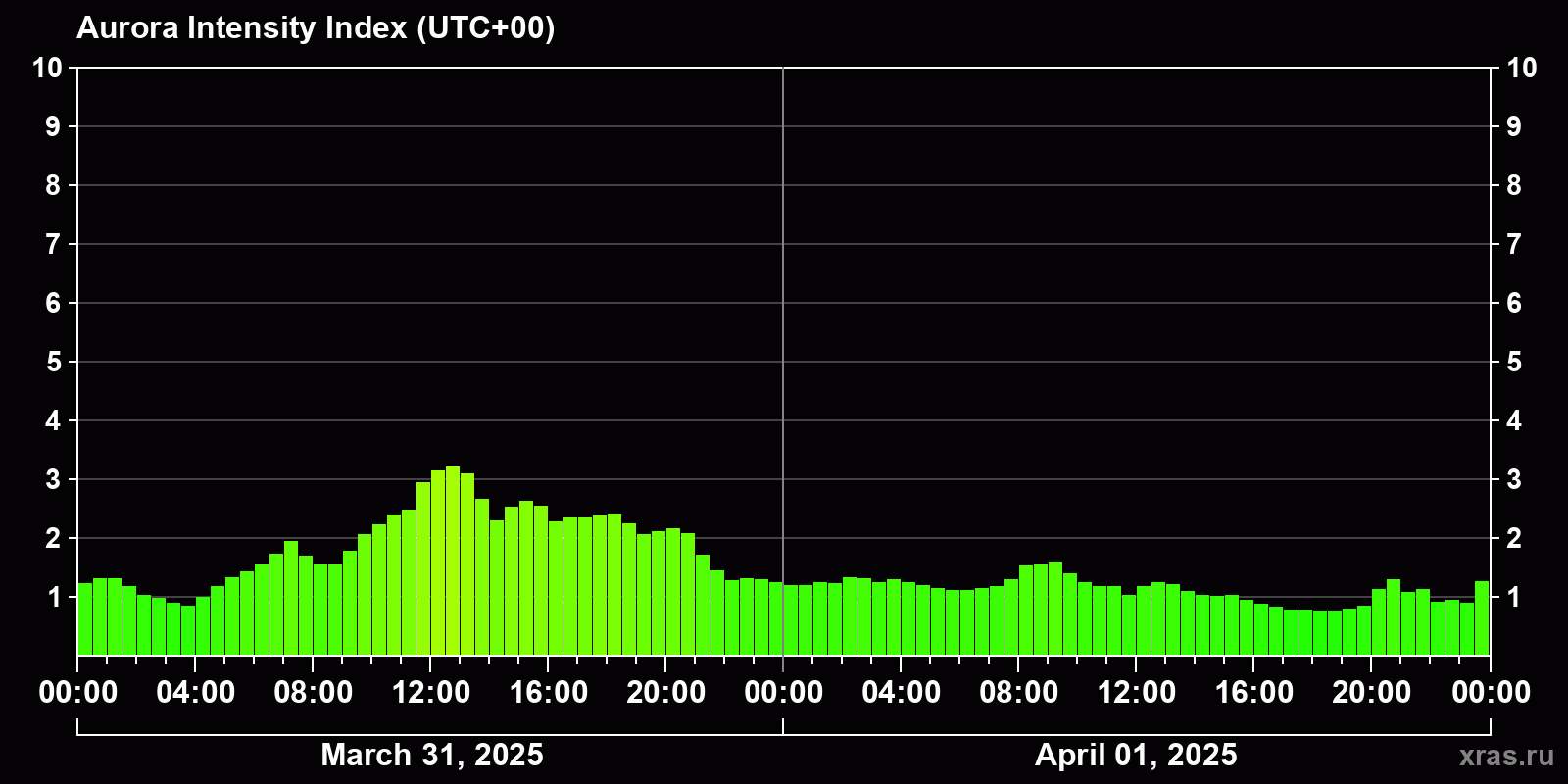 Changes in the auroral intensity index from 2025-03-31 to 2025-04-01 local time