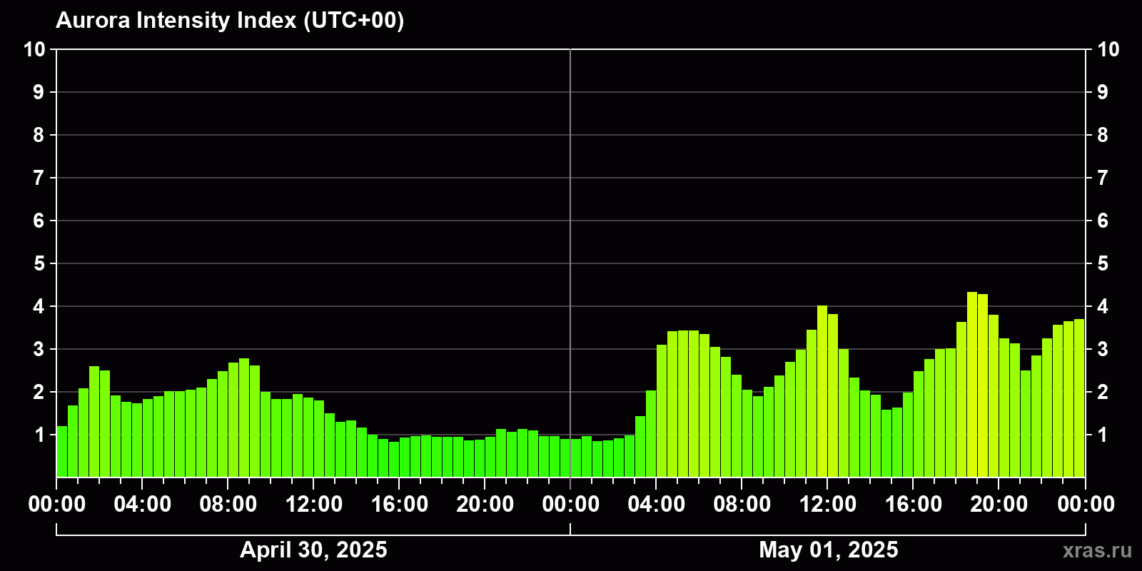 Auroral intensity index and the theoretically possible latitude of observations for nighttime in the Estern Hemisphere as of 2025-05-01 23:55 (end of day) local time