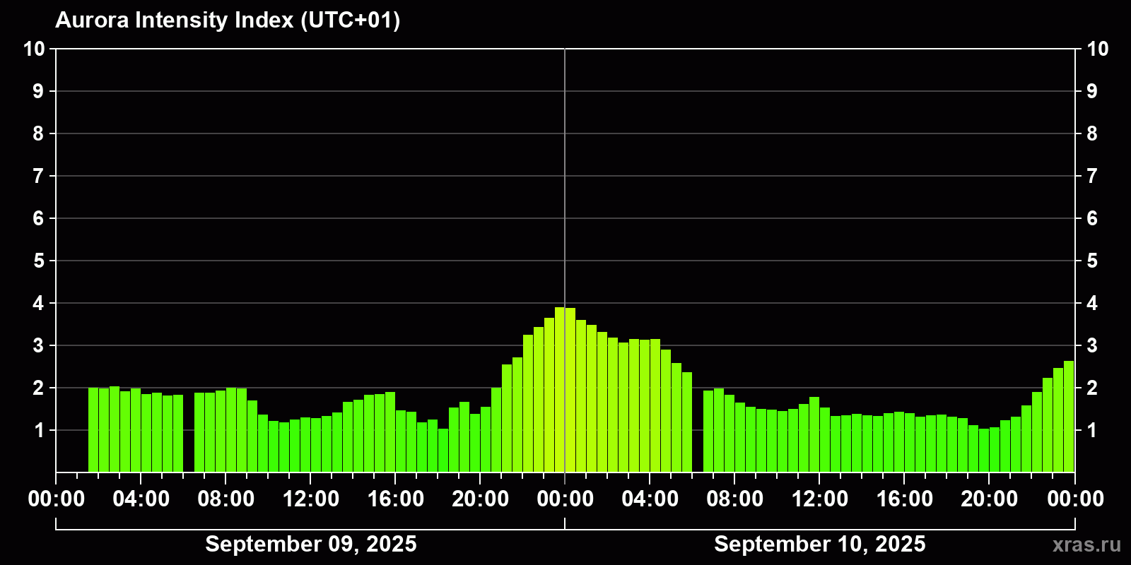 Changes in the auroral intensity index from 2025-09-09 to 2025-09-10 local time
