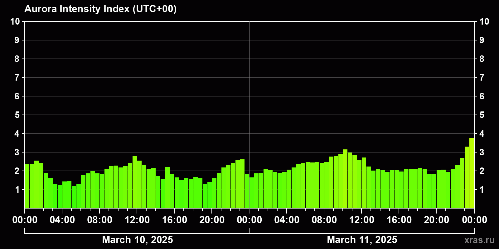 Auroral intensity index and the theoretically possible latitude of observations for nighttime in the Estern Hemisphere as of 2025-03-11 23:54 (end of day) local time