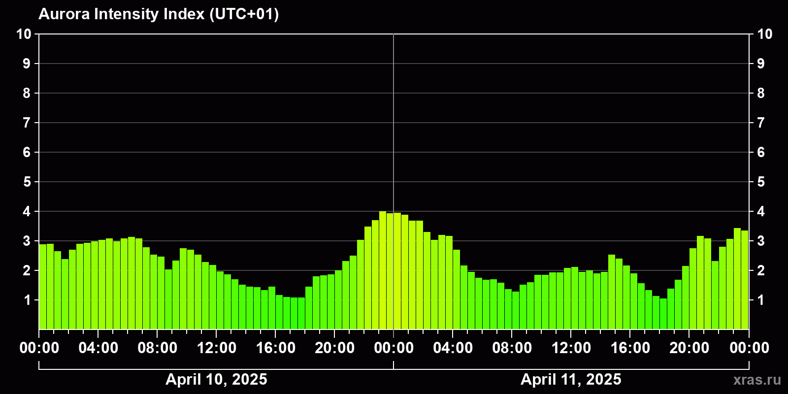 Changes in the auroral intensity index from 2025-04-10 to 2025-04-11 local time