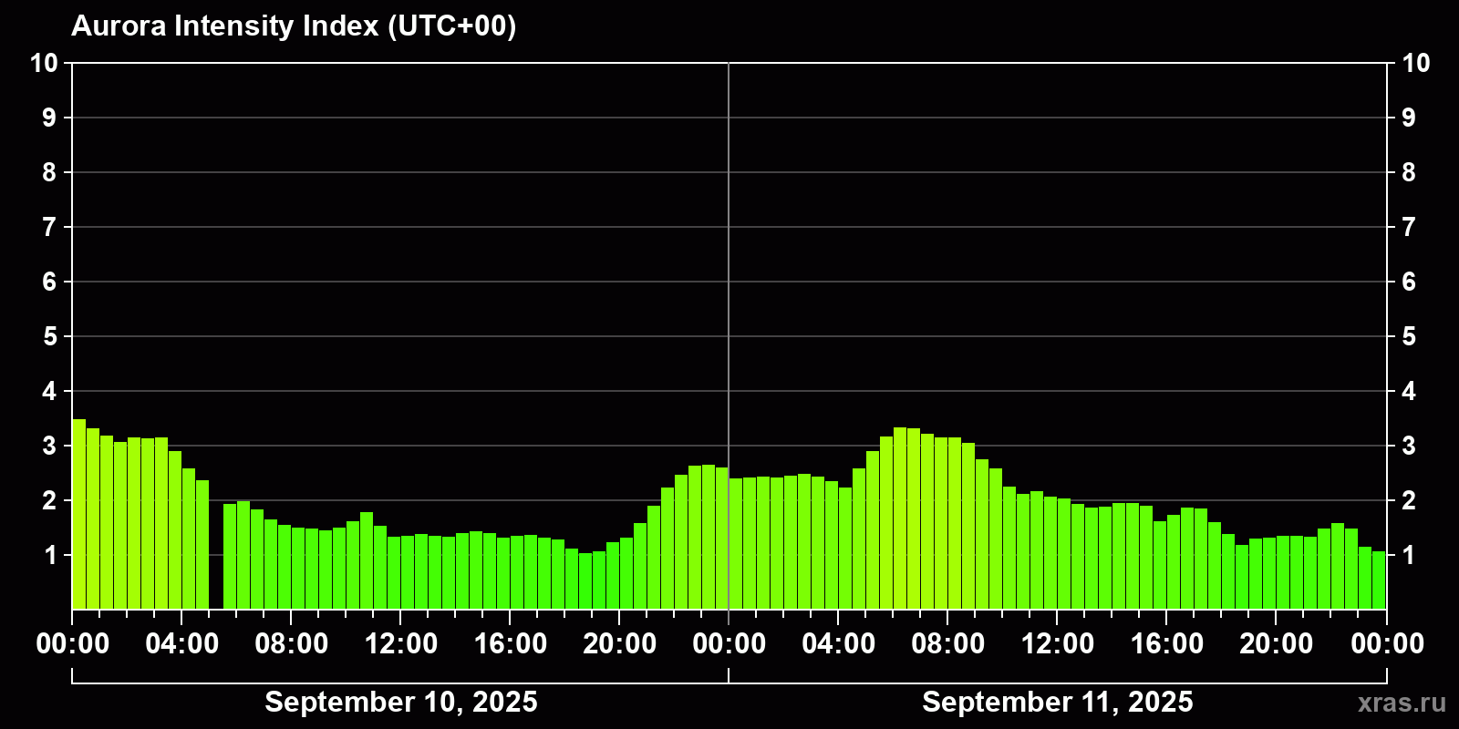 Auroral intensity index and the theoretically possible latitude of observations for nighttime in the Estern Hemisphere as of 2025-09-11 22:59 (end of day) local time