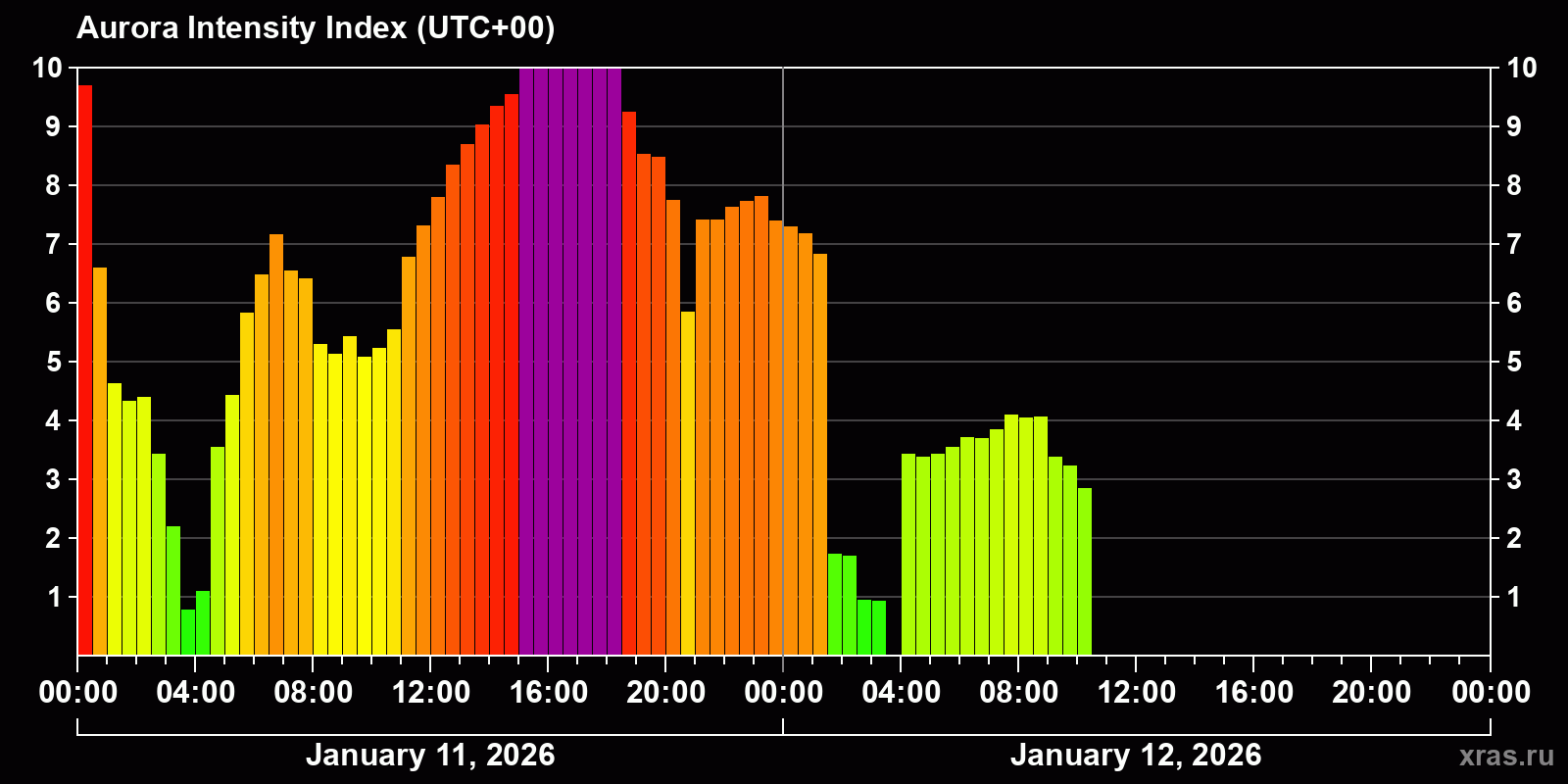 Auroral intensity index and the theoretically possible latitude of observations for nighttime in the Estern Hemisphere as of 2026-01-12 08:11 (end of day) local time