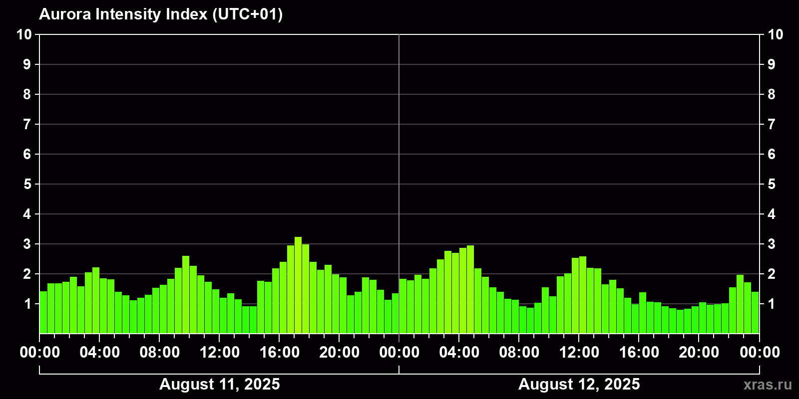 Changes in the auroral intensity index from 2025-08-11 to 2025-08-12 local time