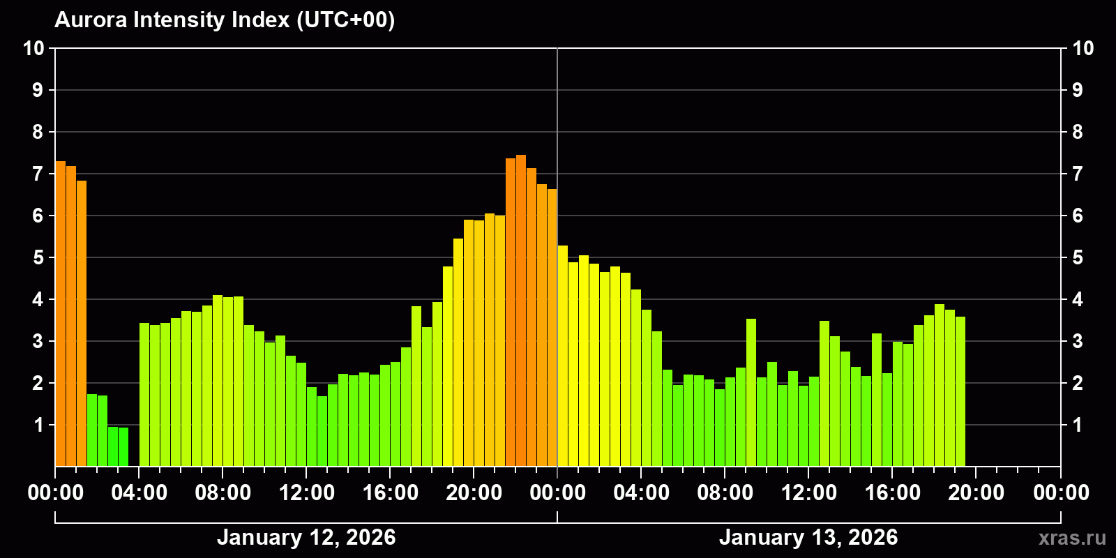 Auroral intensity index and the theoretically possible latitude of observations for nighttime in the Estern Hemisphere as of 2026-01-13 17:23 (end of day) local time