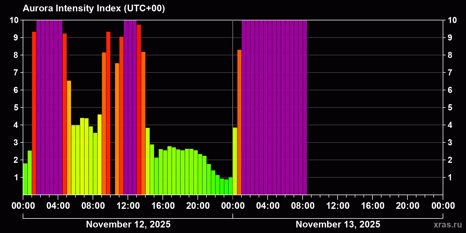 Changes in the auroral intensity index from 2025-11-12 to 2025-11-13 local time