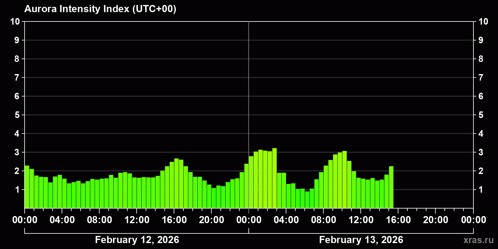 Changes in the auroral intensity index from 2026-02-12 to 2026-02-13 local time