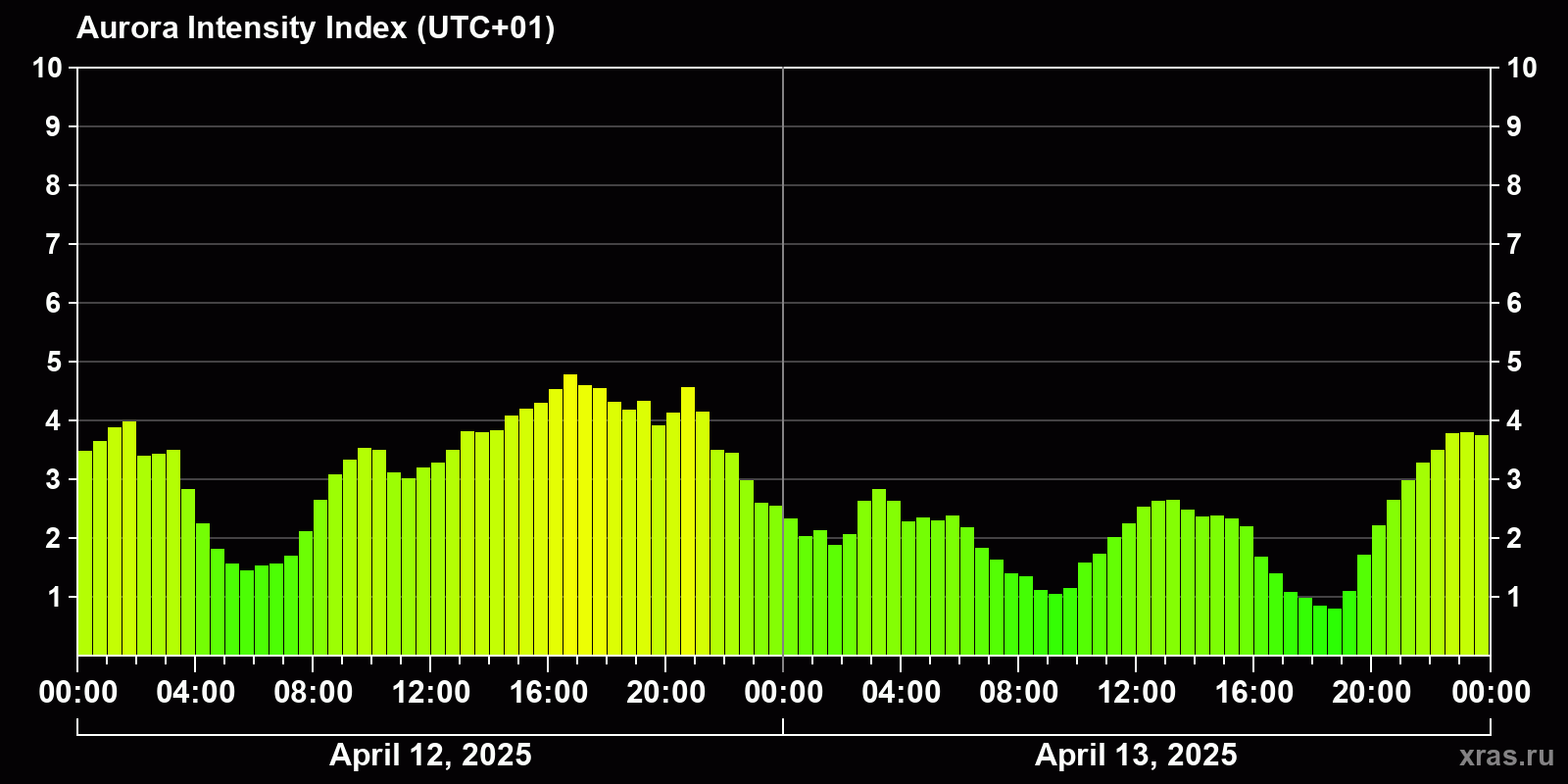 Auroral intensity index and the theoretically possible latitude of observations for nighttime in the Estern Hemisphere as of 2025-04-13 22:45 (end of day) local time