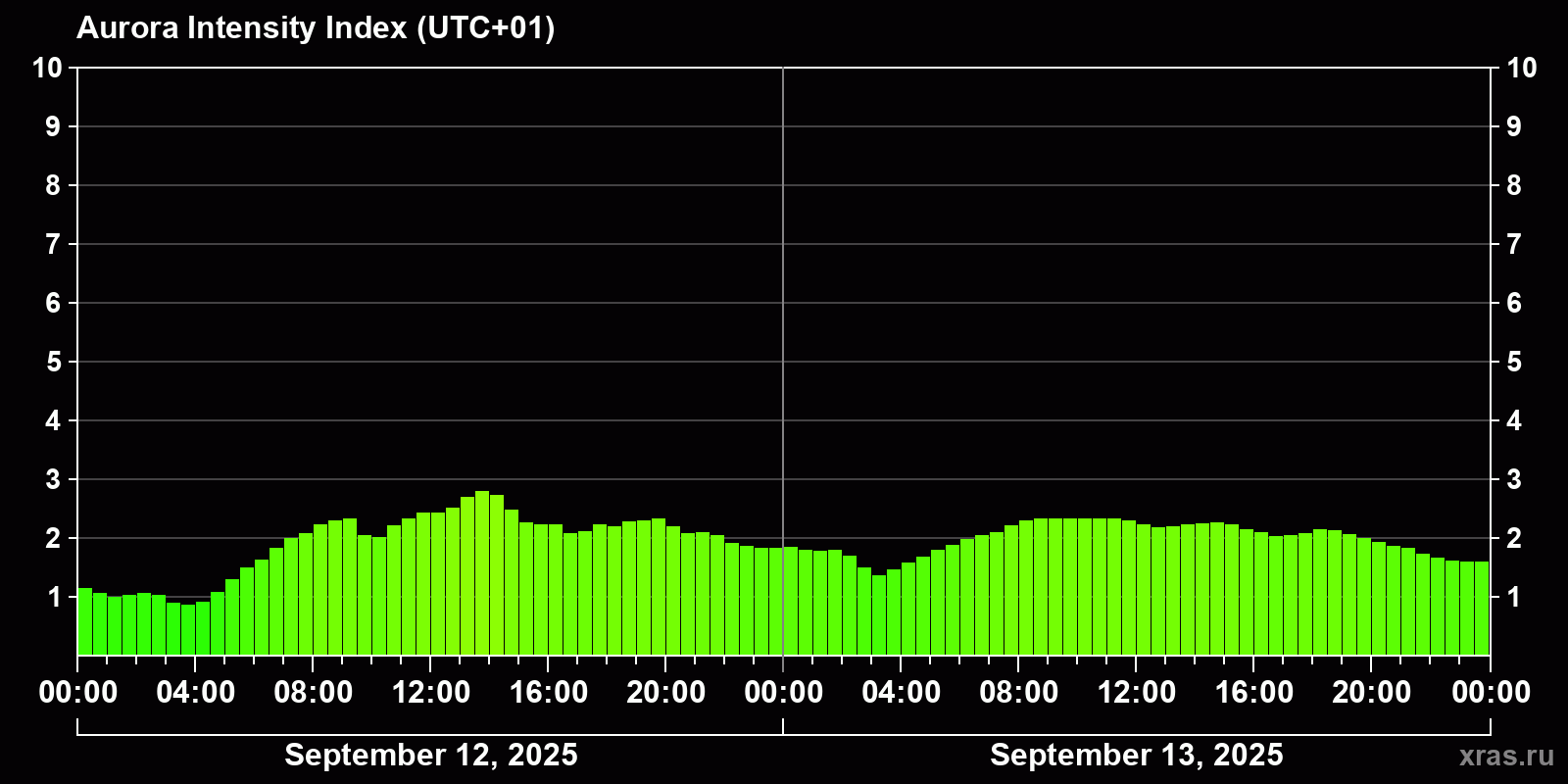 Changes in the auroral intensity index from 2025-09-12 to 2025-09-13 local time