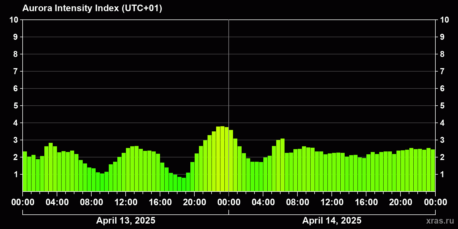 Auroral intensity index and the theoretically possible latitude of observations for nighttime in the Estern Hemisphere as of 2025-04-14 23:52 (end of day) local time