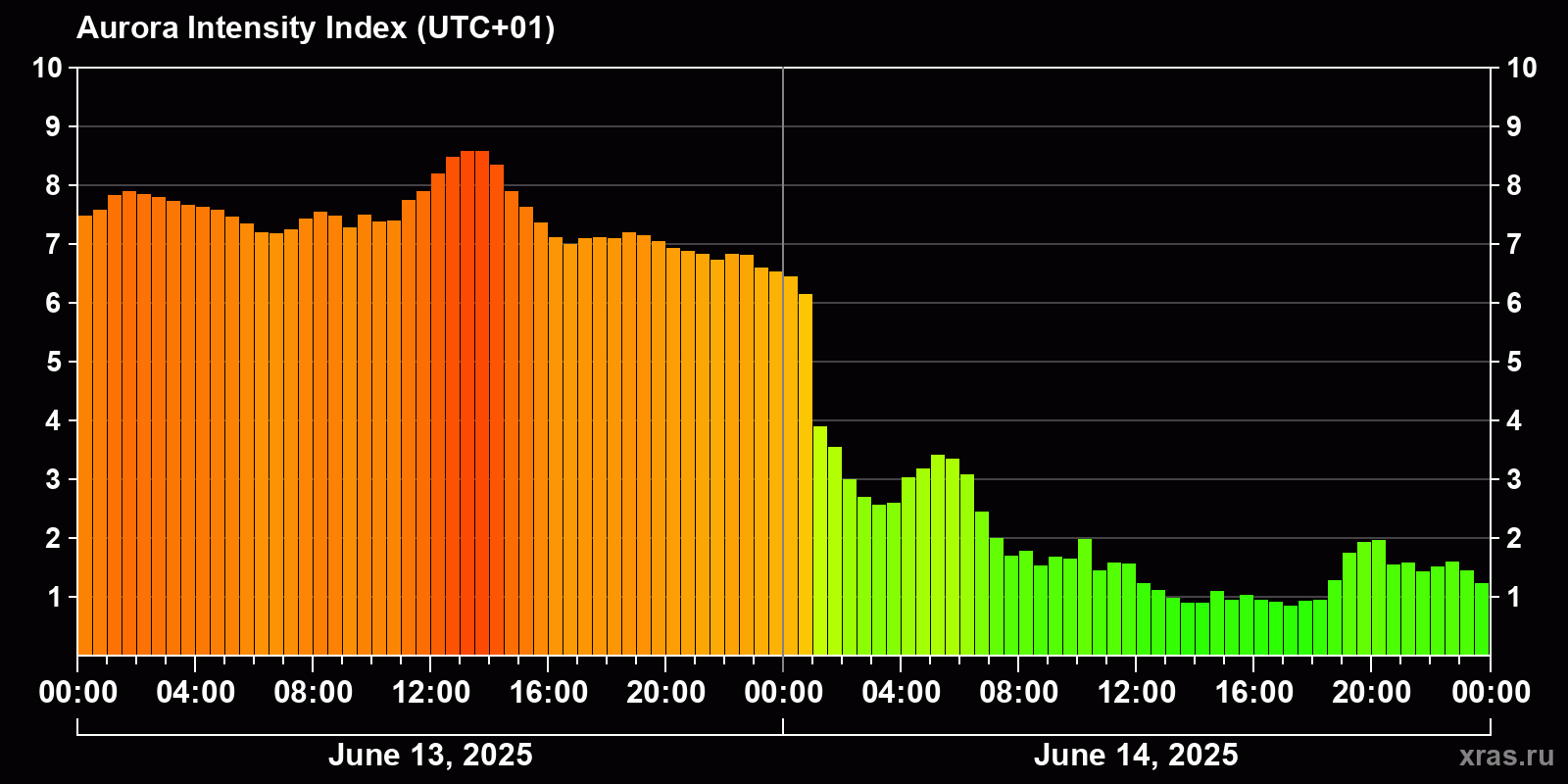 Changes in the auroral intensity index from 2025-06-13 to 2025-06-14 local time