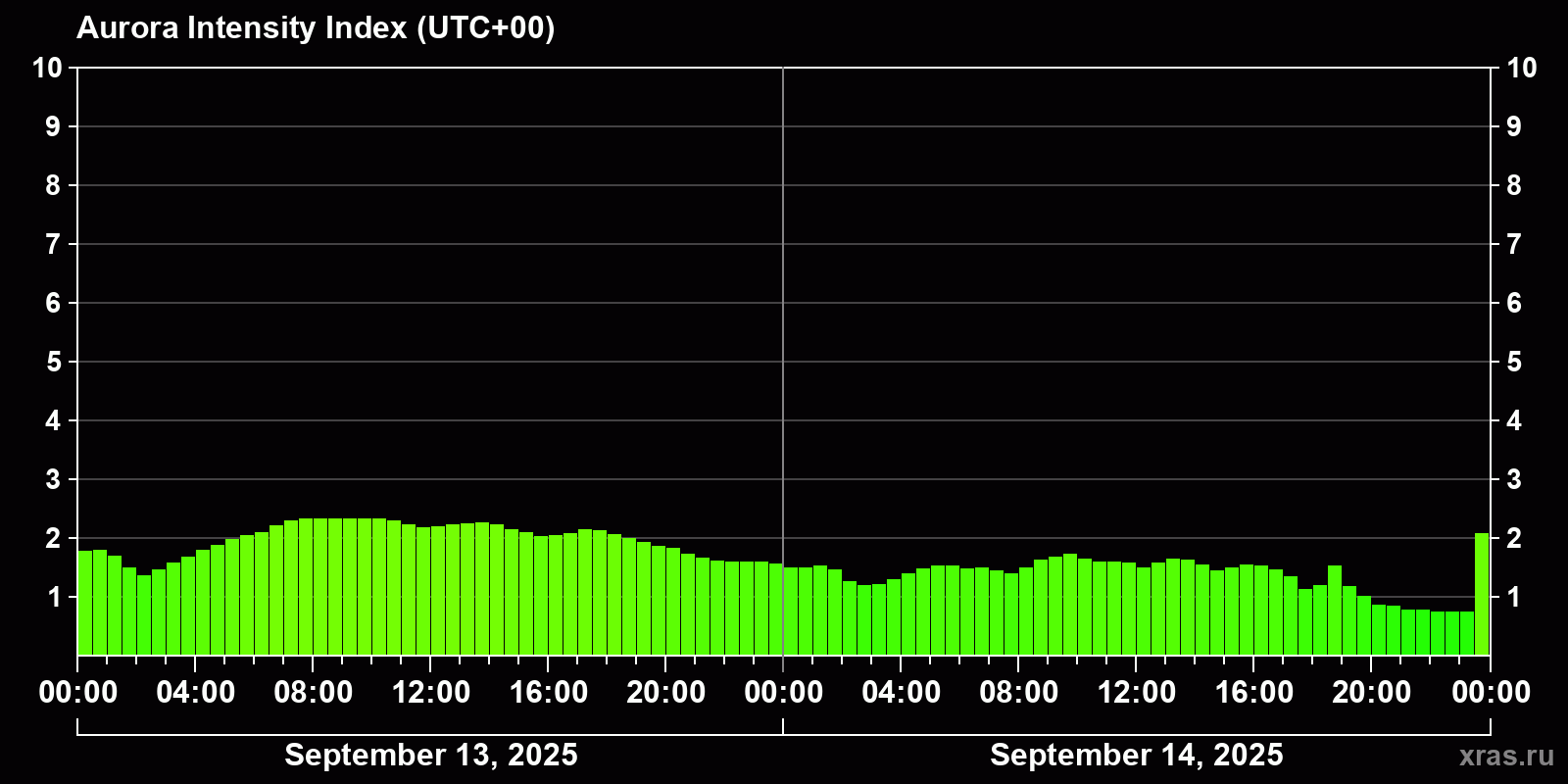 Auroral intensity index and the theoretically possible latitude of observations for nighttime in the Estern Hemisphere as of 2025-09-14 23:46 (end of day) local time