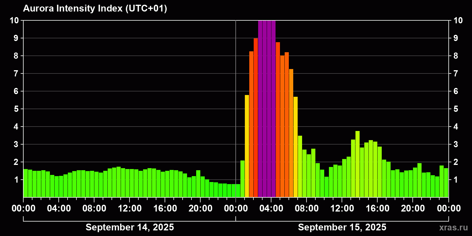 Changes in the auroral intensity index from 2025-09-14 to 2025-09-15 local time