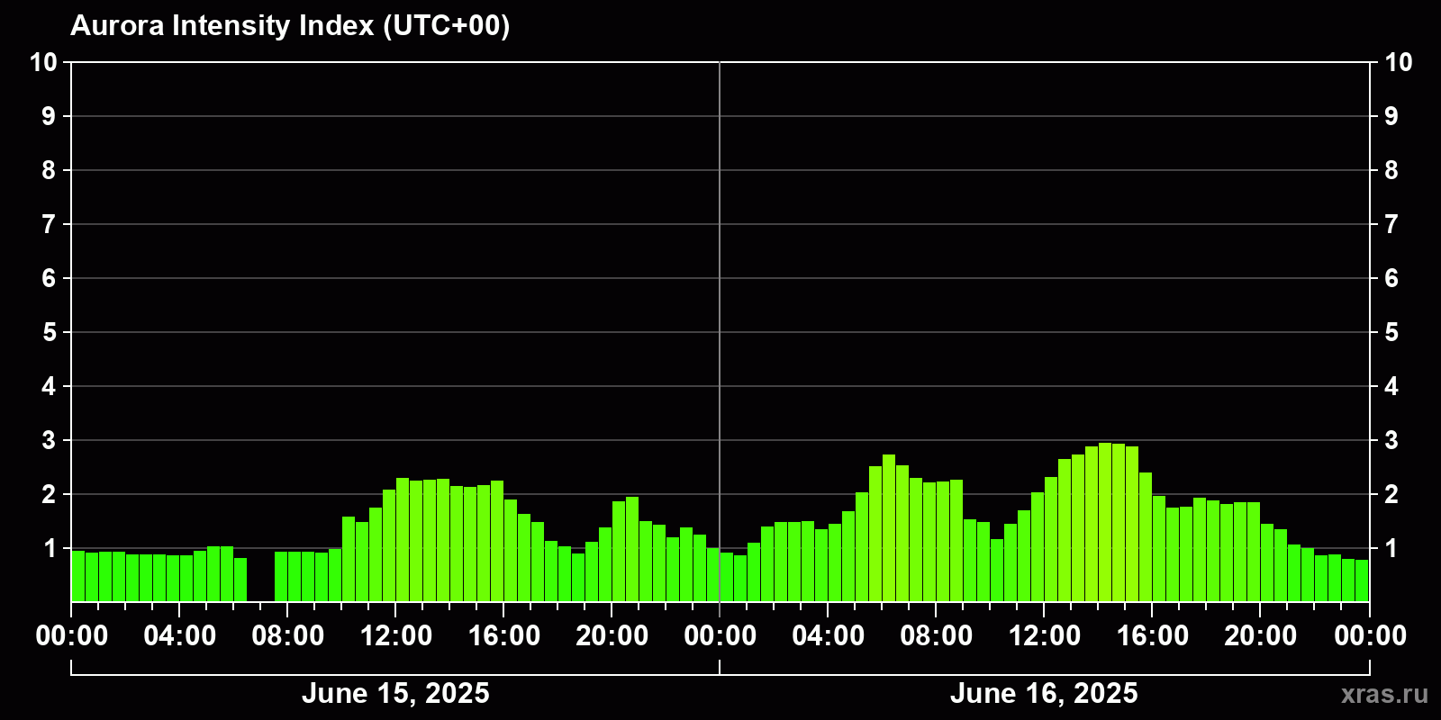 Changes in the auroral intensity index from 2025-06-15 to 2025-06-16 local time