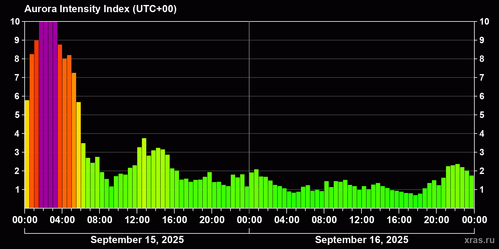 Auroral intensity index and the theoretically possible latitude of observations for nighttime in the Estern Hemisphere as of 2025-09-16 23:45 (end of day) local time