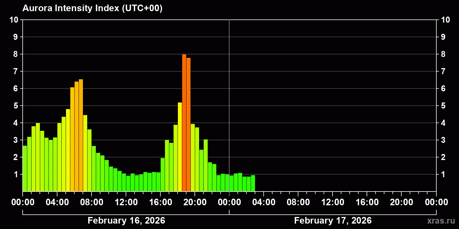 Auroral intensity index and the theoretically possible latitude of observations for nighttime in the Estern Hemisphere as of 2026-02-17 01:03 (end of day) local time