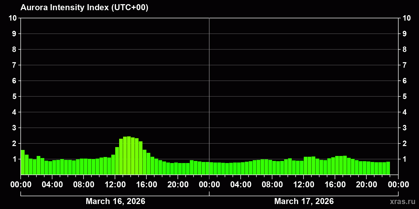 Changes in the auroral intensity index from 2026-03-16 to 2026-03-17 local time