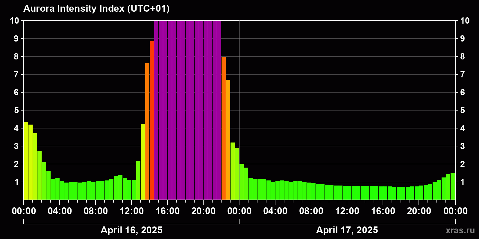 Changes in the auroral intensity index from 2025-04-16 to 2025-04-17 local time