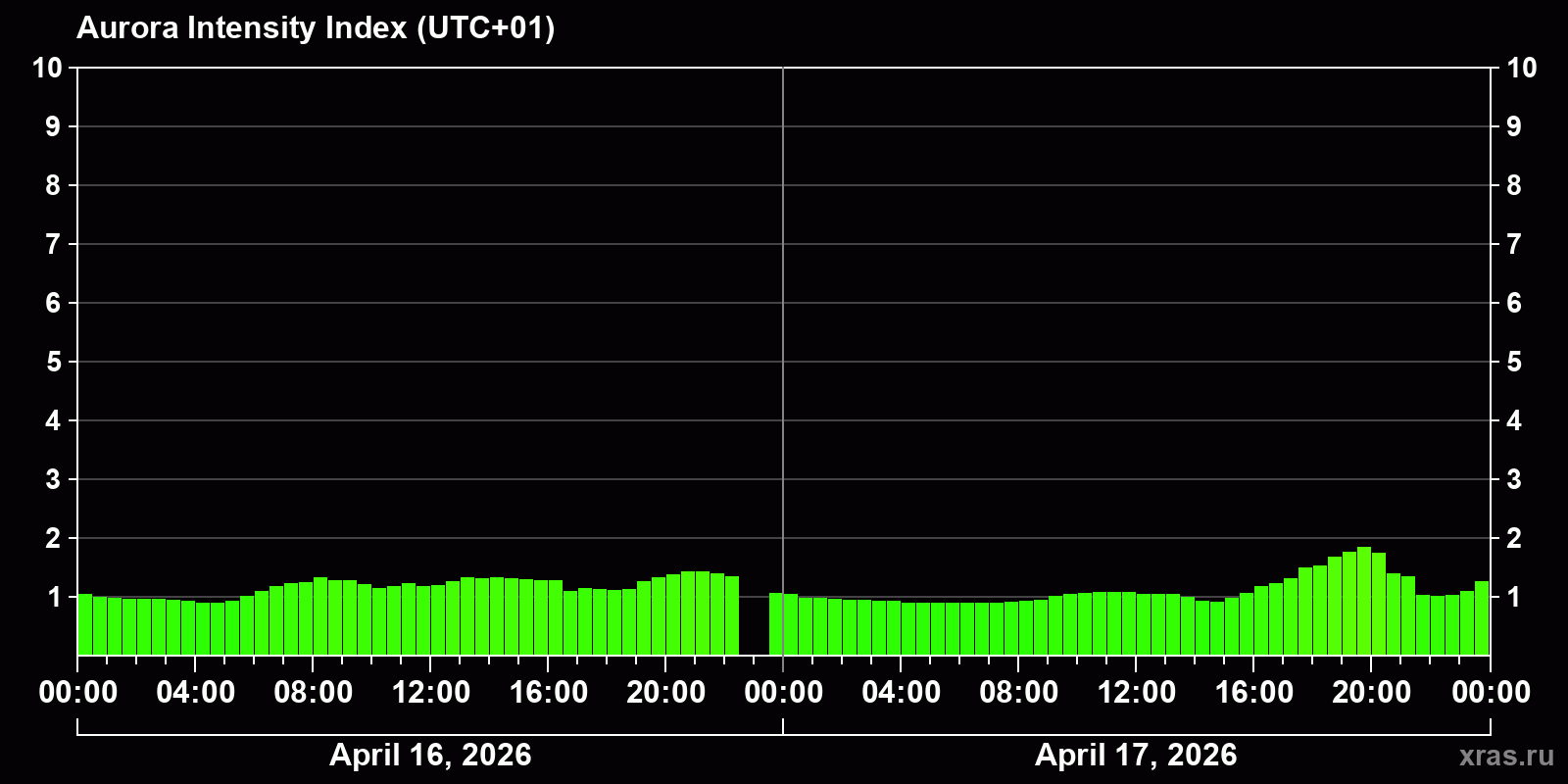 Changes in the auroral intensity index from 2026-04-16 to 2026-04-17 local time