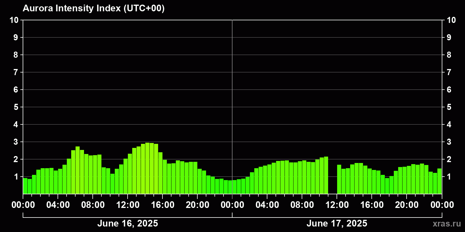 Changes in the auroral intensity index from 2025-06-16 to 2025-06-17 local time