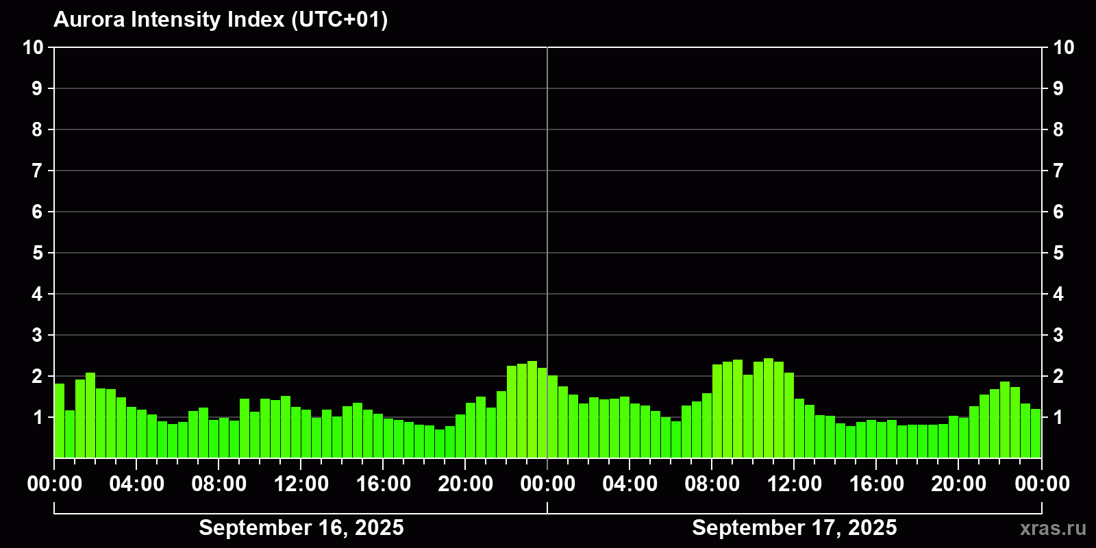 Changes in the auroral intensity index from 2025-09-16 to 2025-09-17 local time