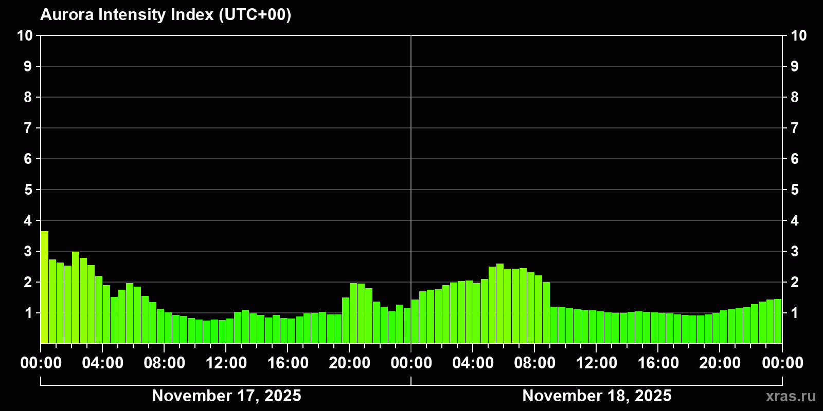Changes in the auroral intensity index from 2025-11-17 to 2025-11-18 local time