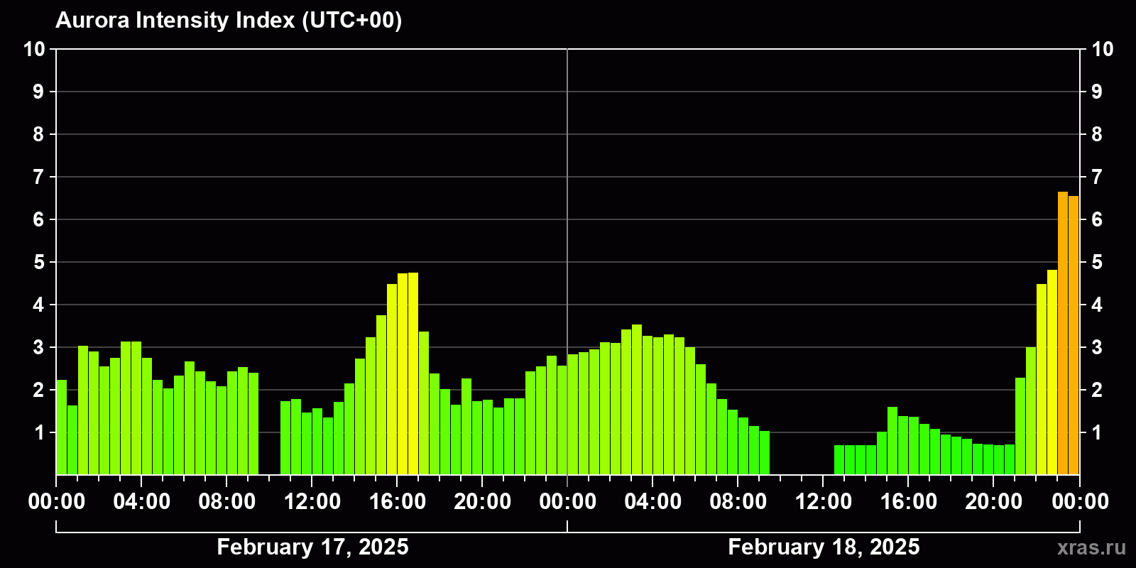 Auroral intensity index and the theoretically possible latitude of observations for nighttime in the Estern Hemisphere as of 2025-02-18 23:52 (end of day) local time