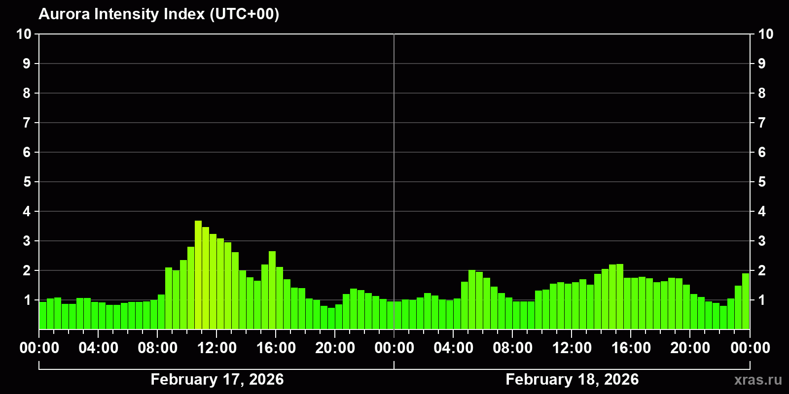 Changes in the auroral intensity index from 2026-02-17 to 2026-02-18 local time