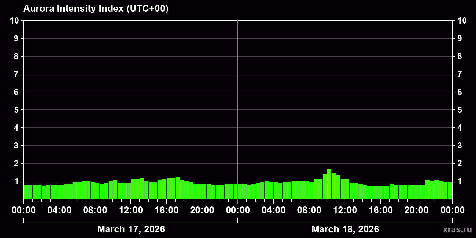 Changes in the auroral intensity index from 2026-03-17 to 2026-03-18 local time