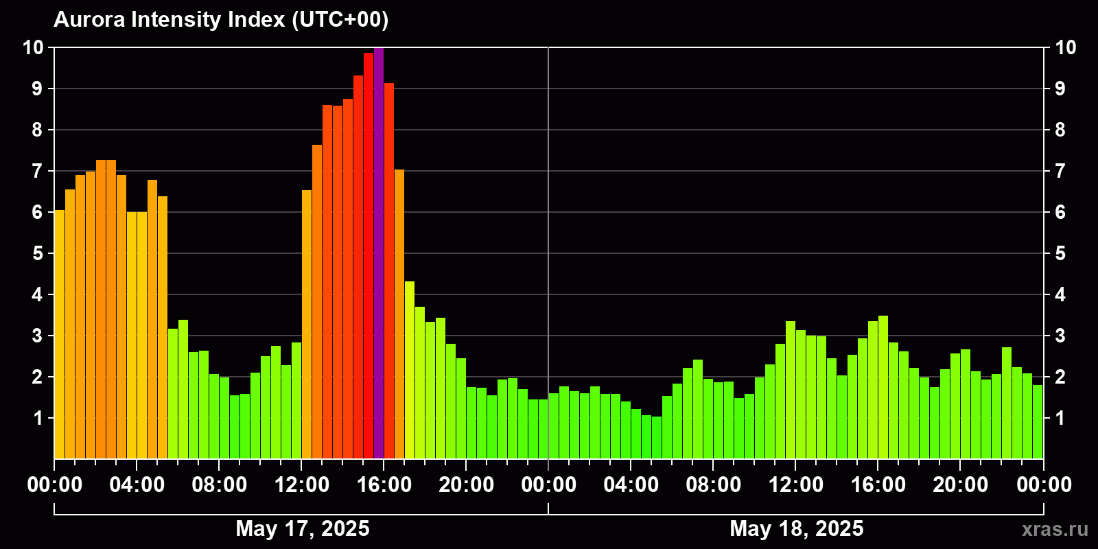 Changes in the auroral intensity index from 2025-05-17 to 2025-05-18 local time