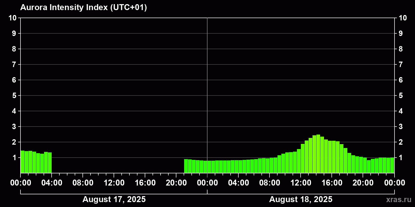 Changes in the auroral intensity index from 2025-08-17 to 2025-08-18 local time