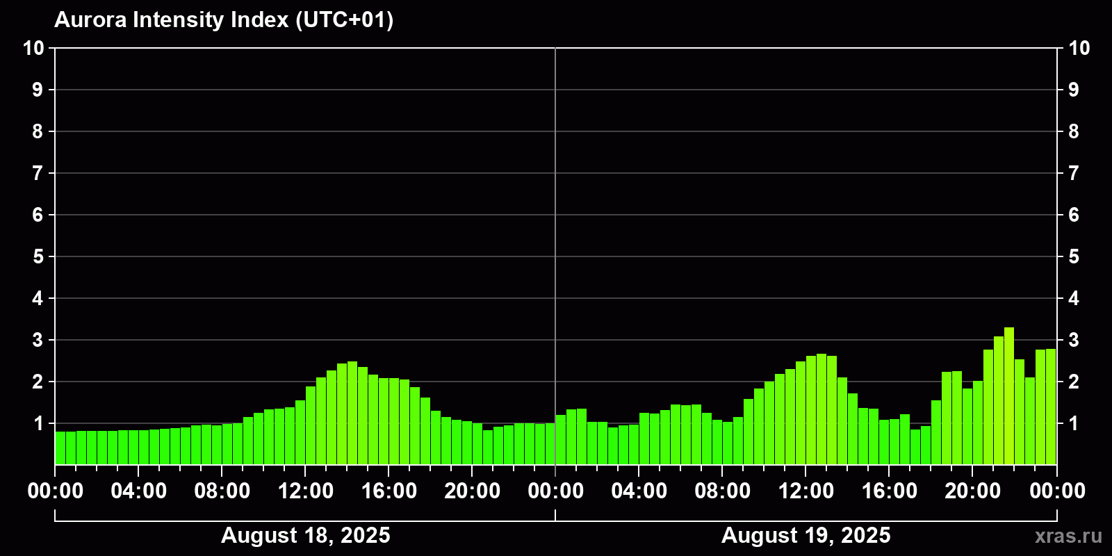 Auroral intensity index and the theoretically possible latitude of observations for nighttime in the Estern Hemisphere as of 2025-08-19 22:57 (end of day) local time
