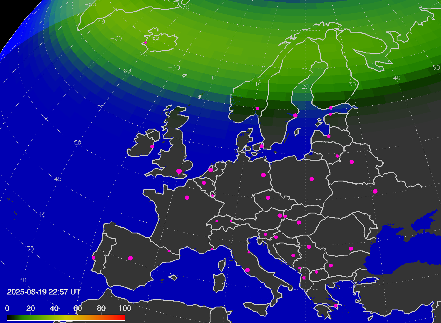 Probability of northern lights (auroras) in cities of Europe
