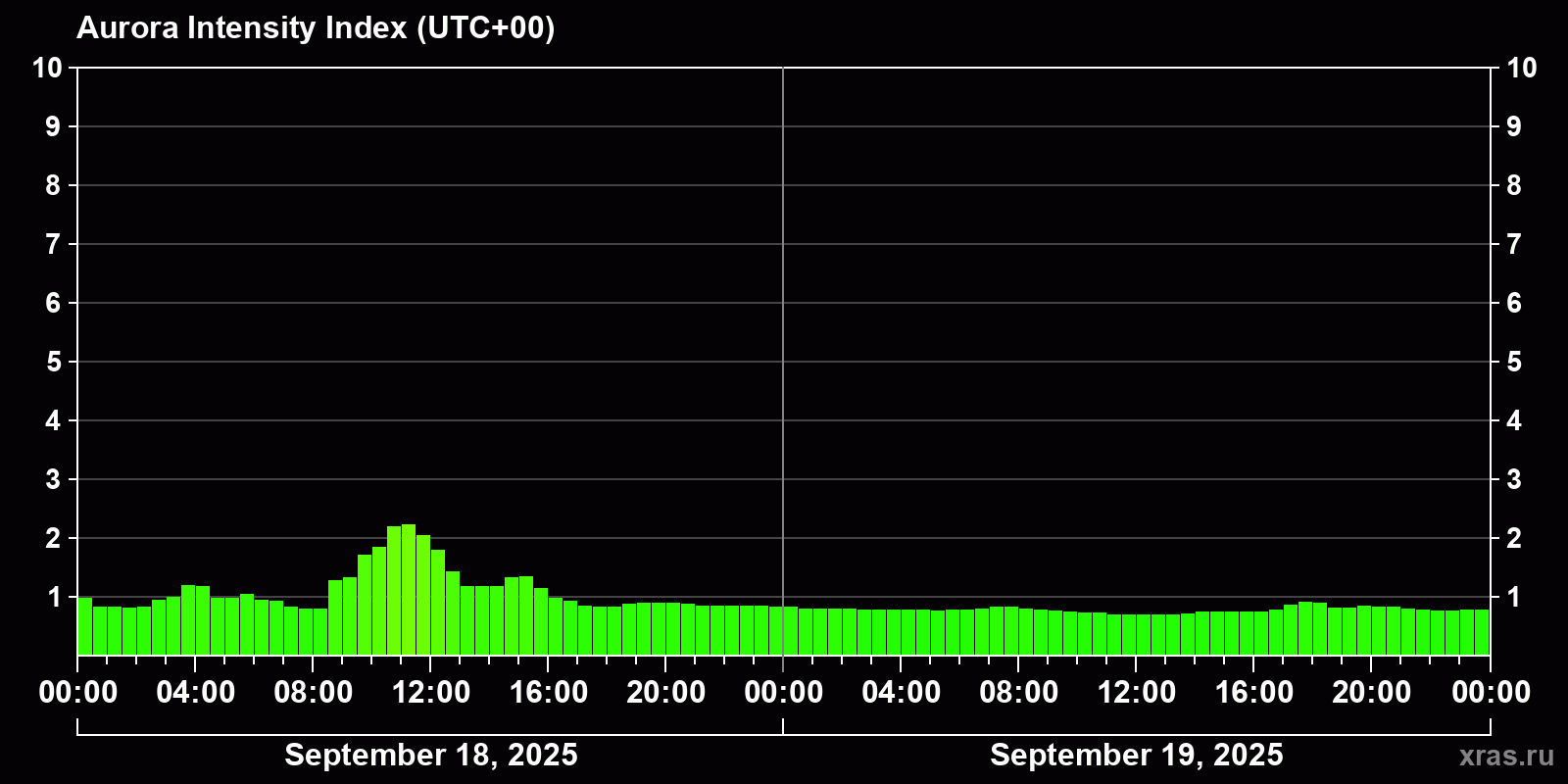 Changes in the auroral intensity index from 2025-09-18 to 2025-09-19 local time