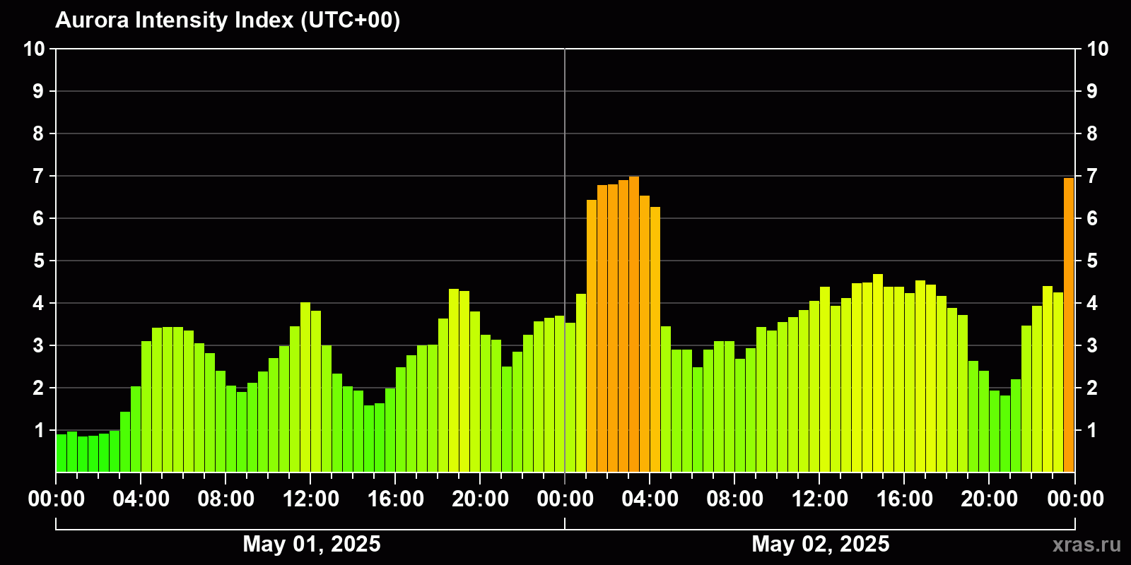 Changes in the auroral intensity index from 2025-05-01 to 2025-05-02 local time