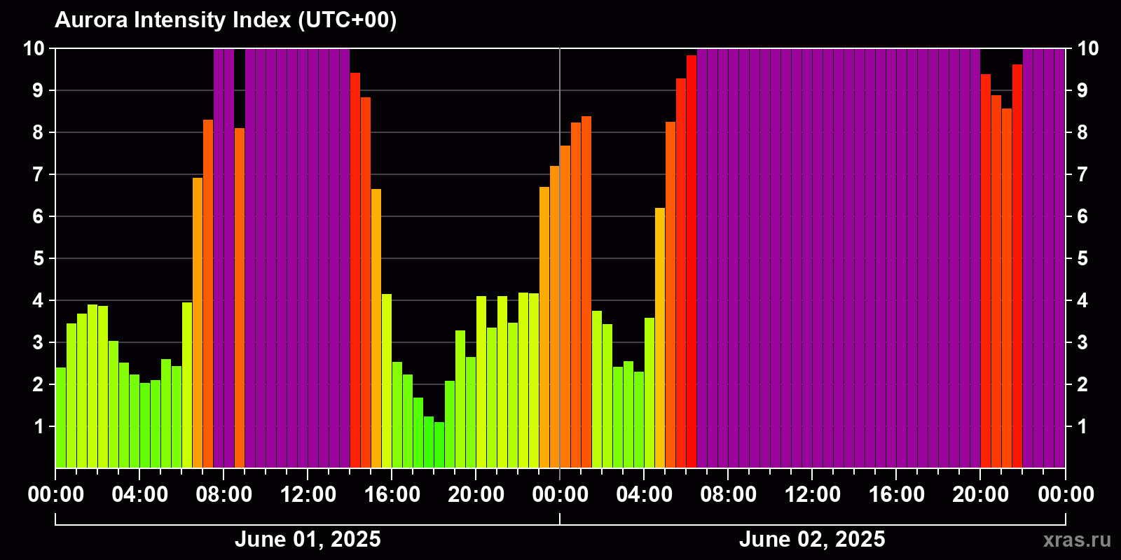 Auroral intensity index and the theoretically possible latitude of observations for nighttime in the Estern Hemisphere as of 2025-06-02 23:57 (end of day) local time