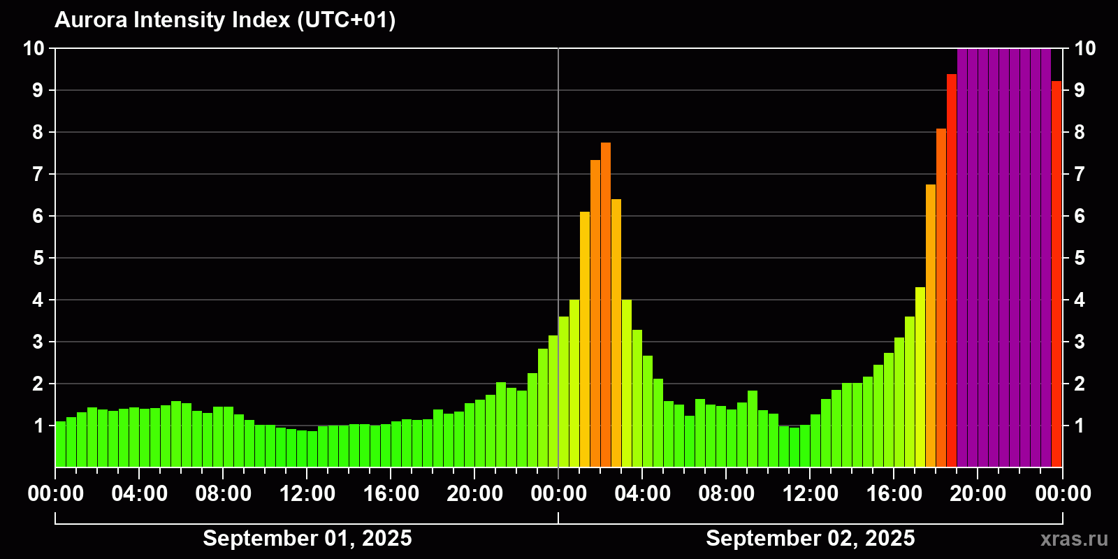 Changes in the auroral intensity index from 2025-09-01 to 2025-09-02 local time