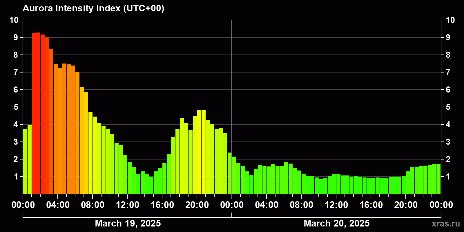 Changes in the auroral intensity index from 2025-03-19 to 2025-03-20 local time