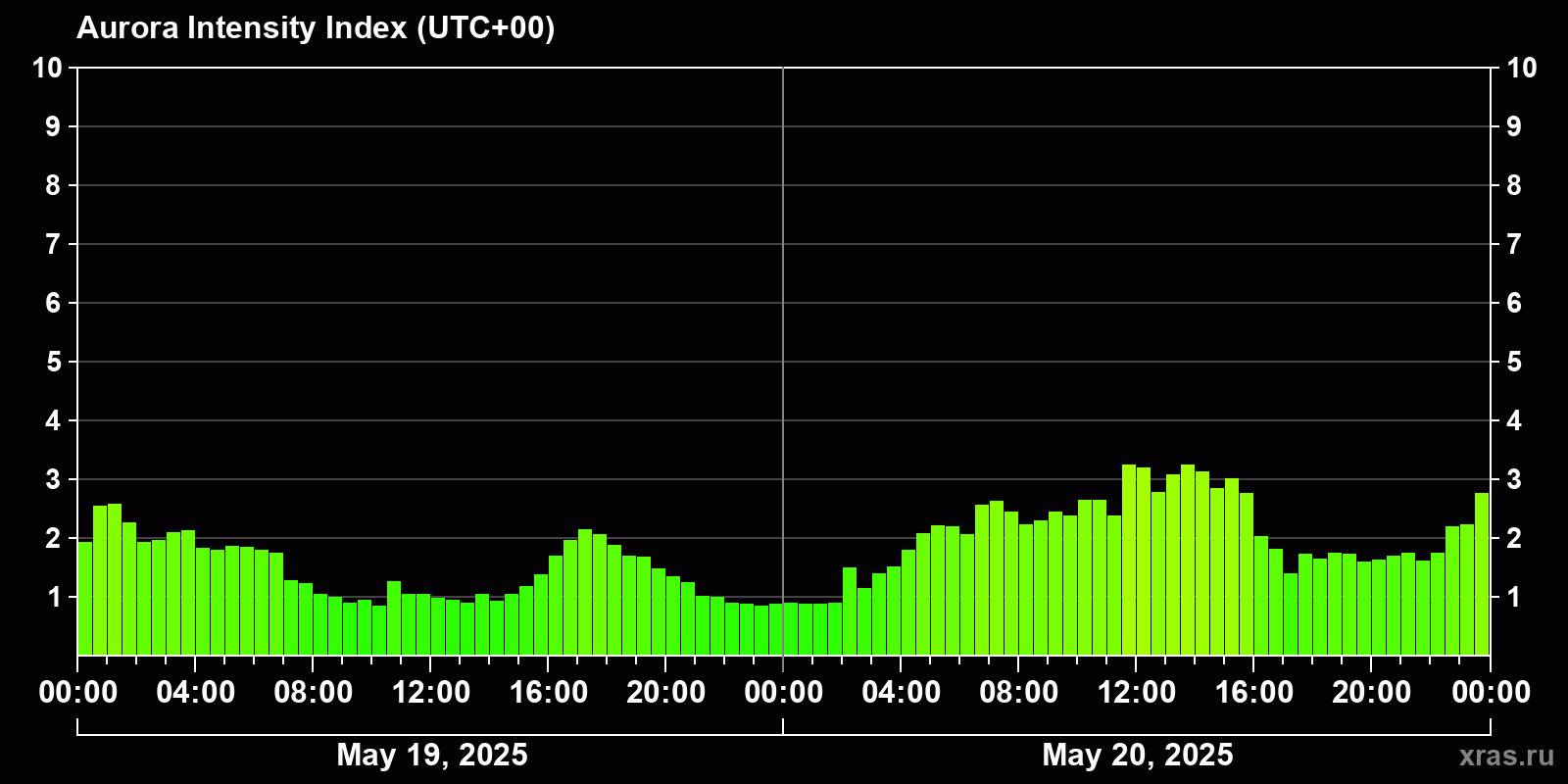 Auroral intensity index and the theoretically possible latitude of observations for nighttime in the Estern Hemisphere as of 2025-05-20 23:55 (end of day) local time