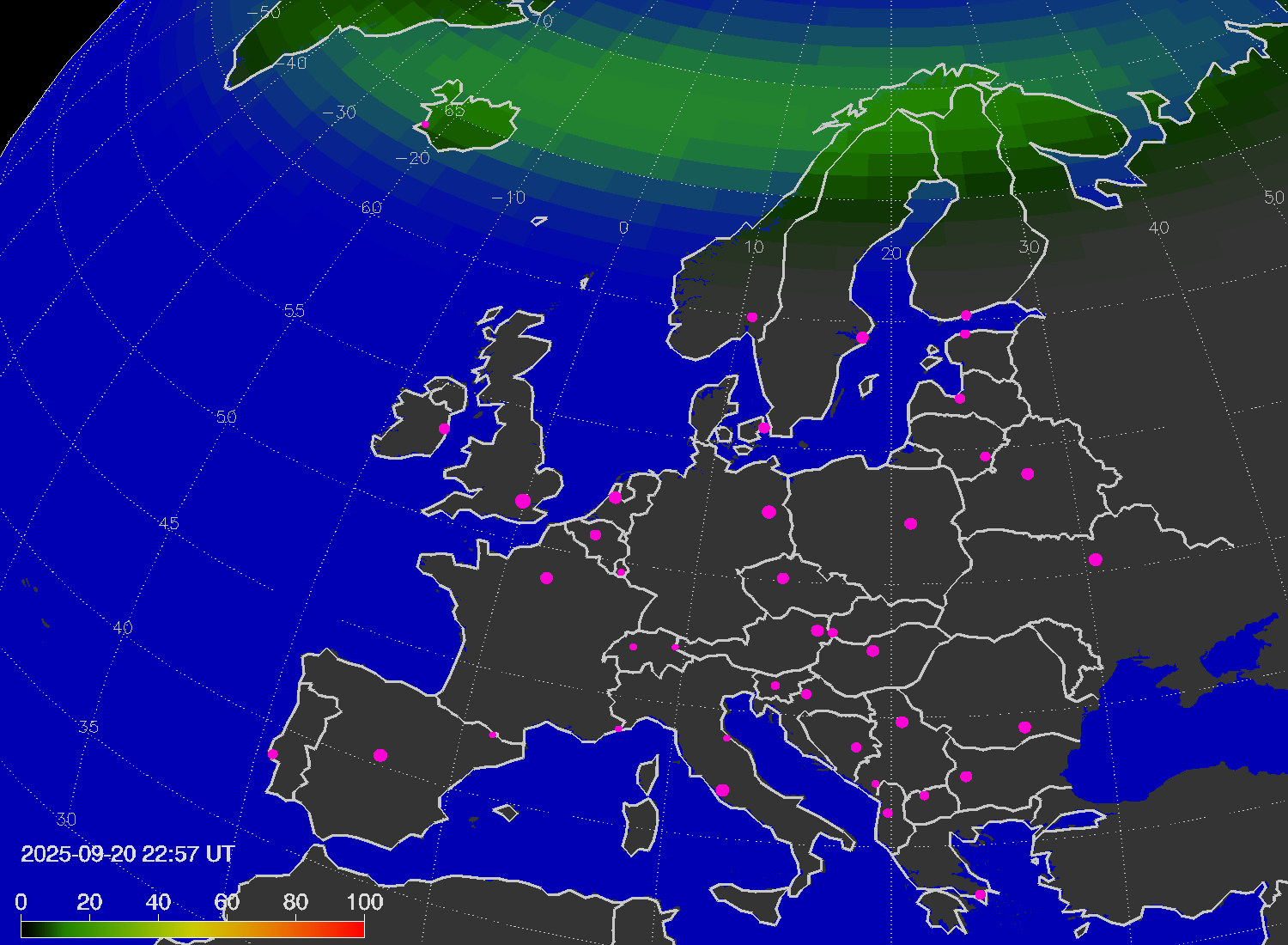 Probability of northern lights (auroras) in cities of Europe