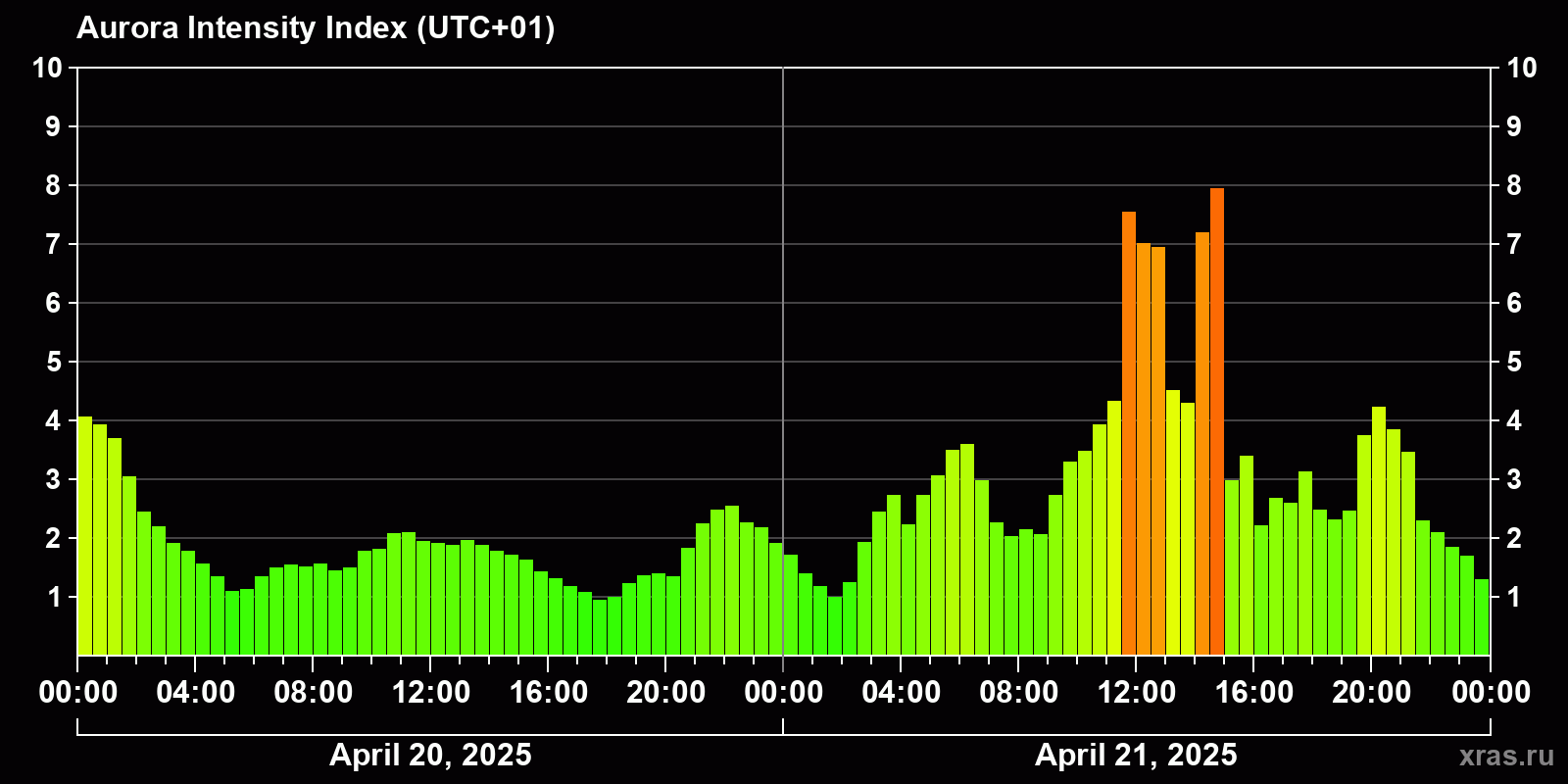 Changes in the auroral intensity index from 2025-04-20 to 2025-04-21 local time